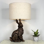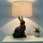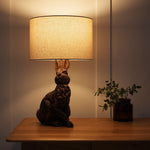 This spectacular vintage table lamp is styled around a sitting rabbit sculpture design. Finished in antique copper resin and topped with a natural linen drum lamp shade with a white inner. Ideal for use in any room in the home, contemporary retro table lamps don't get more desirable. Fitted with an inline rocker switch for a discreet and easy operation. Ideal as a single table lamp or even suitable in pairs.