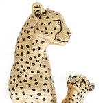 A stunning gold cheetah (leopard) figurine ornament with a parent looking proud at the baby cub. An impressive animal art sculpture that would look elegant on a mantel or side table, with the beautiful gold deign and intricate detailed features. This ornamental animal figure would be a prefect gift for a wildlife lover. Stands 25cm tall.