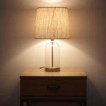A stunning vintage style table lamp with a clear glass bell cloche jar dome base and satin nickel metal accents. A mix of modern day & vintage retro designs creating an eye catching table light whether unlit or illuminated. The satin nickel silver base cap, rod that goes through the middle of the glass & top cap add an industrial vibe to the overall look. Complete with a high quality natural linen tapered drum shade. Ideal as a single table desk lamp or paired to balance the room.