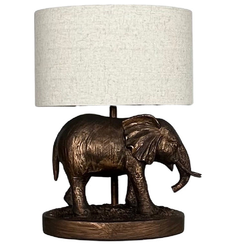This spectacular vintage table lamp is styled around a elephant sculpture design. Finished in bronze resin and topped with a Linen Natural oval drum rolled edge shade with a white inner. Ideal for use in any room in the home, contemporary retro table lamps don't get more desirable. Fitted with an inline rocker switch for a discreet and easy operation. Ideal as a single table lamp or even suitable in pairs.