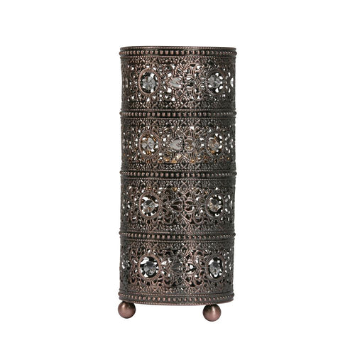 The Oaks 8201 TL CU is a Moroccan style table lamp in Antique Copper. Its decorative cylindrical base, supported slightly above the surface with its round metal feet, features intricate filigree-style patterns and bead detailing, giving it a vintage appearance. A classic décor addition to any Mediterranean-inspired room. Perfect for living rooms or bedrooms, end or side tables