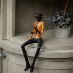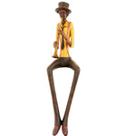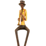 A stunning resin sitting jazz musician playing the trumpet musical instrument art sculpture figurine ornament. Handcrafted, this high definition resin figure sits 39cm high and finished in brown and yellow main colours. The artwork figure shows a tall, slender leggy cool musician playing music on the trumpet instrument that will sit perfectly on any ledge or bookshelf. A perfect gift for music lovers, that will create a talking point in any room in the home. Manufactured from resin with high definition clarity.