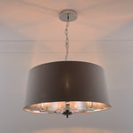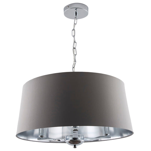A stunning three lamp polished chrome metalwork pendant ceiling light surrounded with a quality grey cotton fabric tapered drum shade. The chrome round fixing plate extends to a decorative chain that supports the grey shade with a metallic silver lining that reflects the light. A ceiling light fitting that looks equally good unlit or illuminated. Can used as a single indoor pendant light or paired either end of a longer room. Perfect for the living room, bedroom or above a dining table.