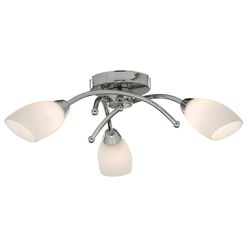 The Searchlight 8183-3CC is a striking 3-lamp semi-flush ceiling light that brings a touch of modern elegance to any space. Featuring a polished chrome finish and gracefully curved arms, it delivers a sleek, contemporary look that complements both classic and modern interiors. Each of the three gently arched stems supports a smooth opal glass shade, providing soft, diffused light that creates a warm and welcoming atmosphere. The round ceiling rose plate adds a stylish finishing touch, making this piece a beautiful centrepiece for your living room, hallway, or bedroom