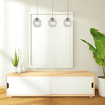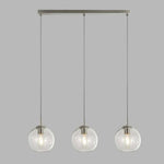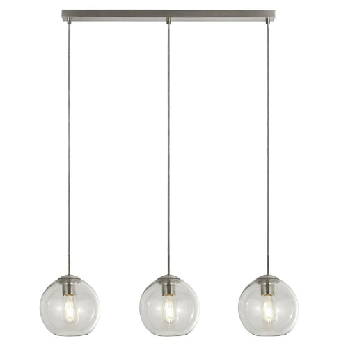 A stunning polished chrome bar pendant ceiling light with three high quality clear glass dome shades. With a mix of modern and retro vintage styles this pendant light would look eye catching in any type of decor taste. The rectangular fixing plate extends to 3 cables that each support the open ended globe glass lampshades. A 860mm wide fitting that is perfect above a dining table or kitchen breakfast bar. Looks equally beautiful whether unlit or when switched on.