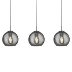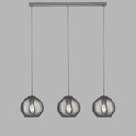 A stunning polished chrome bar pendant ceiling light with three high quality smoked glass dome shades. With a mix of modern and retro vintage styles this pendant light would look eye catching in any type of décor taste. The rectangular fixing plate extends to 3 cables that each support the open ended globe glass lampshades. A 860mm wide fitting that is perfect above a dining table or kitchen breakfast bar. Looks equally beautiful whether unlit or when switched on.