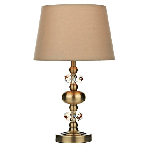 DAR EDI4175 Edith Antique Brass Touch Table Lamp with Taupe Tapered Shade - 30cm Height  The DAR EDI4175 touch table lamp that has a rounded stepped base supporting a baluster-style...