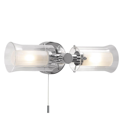 DAR ELB0950 Elba Polished Chrome Bathroom 2 Lamp Switched Wall Light with Glass Shade - 32cm Width  The DAR ELB0950 Elba Bathroom Wall Light features a circular chrome backplate with...