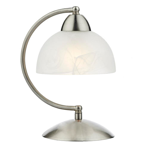 DAR SAX4046 Saxby Satin Chrome Curved Arm Touch Table Lamp with Alabaster Glass – 25cm Height  The DAR SAX4046 Saxby Curved arm touch table lamp features a domed base and...
