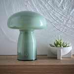 K Living LCORYGREE/TL Green Glass Mushroom Shaped Modern Touch Rechargeable Table Lamp - 19cm Height  Bring a warm, modern glow to any space with this mushroom-shaped rechargeable table lamp. Designed...