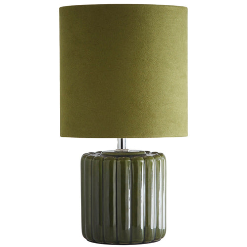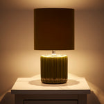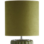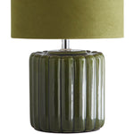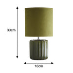 K Living LZOEGREEN/TLWS Green Ribbed Ceramic Vintage Table Lamp with Velvet Drum Shade - 33cm Height  A stunning vintage style table lamp with a green ceramic vertical ribbed effect base...