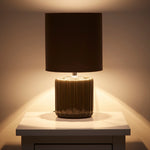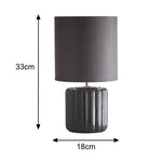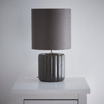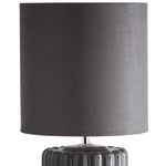 K Living LZOEGREY/TLWS Grey Ribbed Ceramic Vintage Table Lamp with Velvet Drum Shade - 33cm Height  A stunning vintage style table lamp with a grey ceramic vertical ribbed effect base...