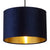 A stunning round drum lampshade made from high grade navy blue velvet fabric with a gold metallic hard lined inner. The velvet fabric material has a luxury look and feel. 12 inches diameter size (30cm) ideal for hanging from the ceiling or use as a table or floor lamp shade. Complete with a shade reducing ring to fit all types of existing lampholder.