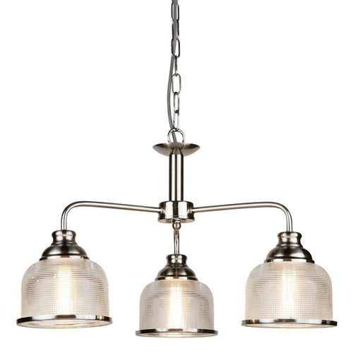 Searchlight 1683-3SS Bistro II Satin Silver Vintage 3 Lamp Pendant with Rib Glass Shades - 56cm Diameter  The Searchlight 1683-3SS Satin Silver & Holophane Glass Vintage Dome 3 Lamp Pendant...