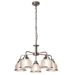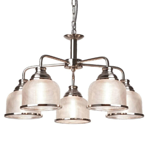 Searchlight 1685-5SS Satin Chrome & Holophane Glass Vintage Dome 5 Lamp Pendant Light - 58cm Diameter  The Searchlight 1685-5SS Satin Silver & Holophane Glass Vintage Dome 5 Lamp Pendant Light combines timeless...