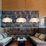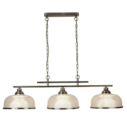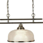 Searchlight 3593-3AB Antique Brass & Holophane Glass Vintage Dome 3 Lamp Bar Pendant - 99cm Width  The Searchlight 3593-3AB Antique is perfectly suited for kitchens, dining areas, or bars. This pendant light...