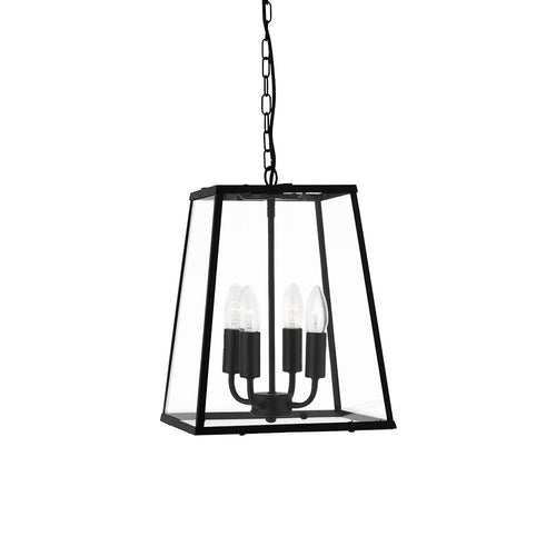 Searchlight 5614BK Voyager Matt Black 4 Lamp Vintage Tapered Rectangle Lantern Pendant - 29cm Diameter  The Searchlight 5614BK Pendant is designed with a tapered lantern-style frame and clear glass panels,...