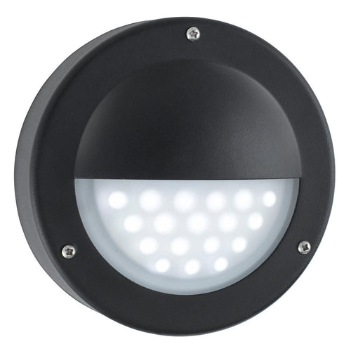 Searchlight 8744BK LED Black Outdoor Modern Round Bulkhead Wall Light. This Black 18 LED Circular Outdoor Wall Light with Acid Glass is small, stylish and discreet. The circular fitting uses...