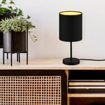Trio R50491080 Matt Black Modern Stem Slimline Table Lamp with Drum Shade - 28cm Height  A simplistic modern metal slimline stem indoor table lamp desk light finished in matt black with a matching fabric drum lampshade (gold inner)....